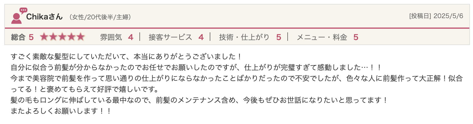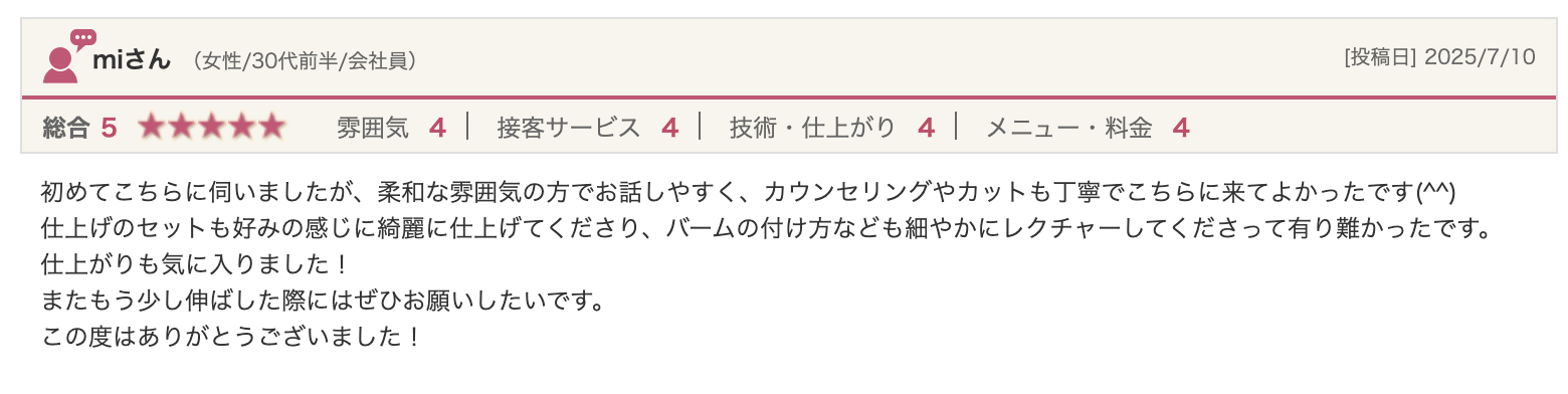 「丁寧に対応していただき、ゆったり過ごせました。仕上がりも見せた写真のイメージ通りに仕上げてもらって嬉しいです!また利用させていただきます!」 ★★★★★ 5.0(髪質改善トリートメント+カラー)