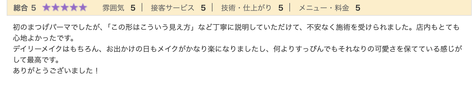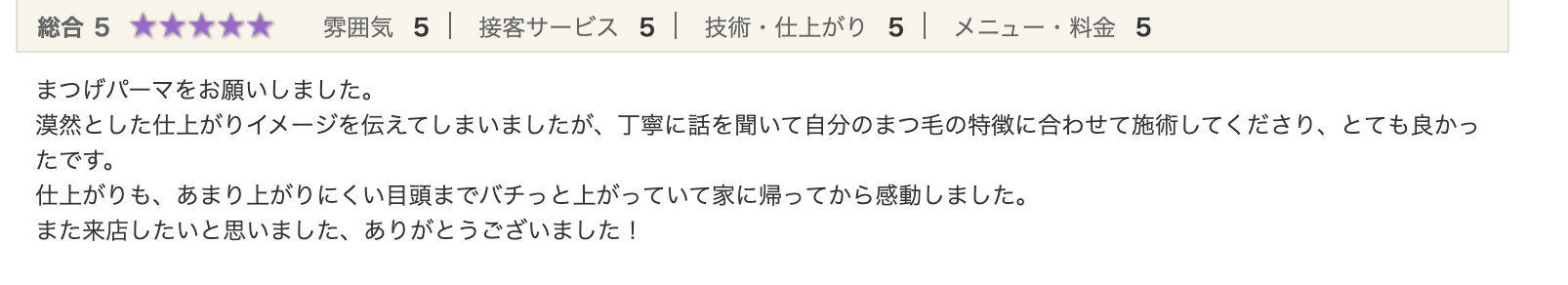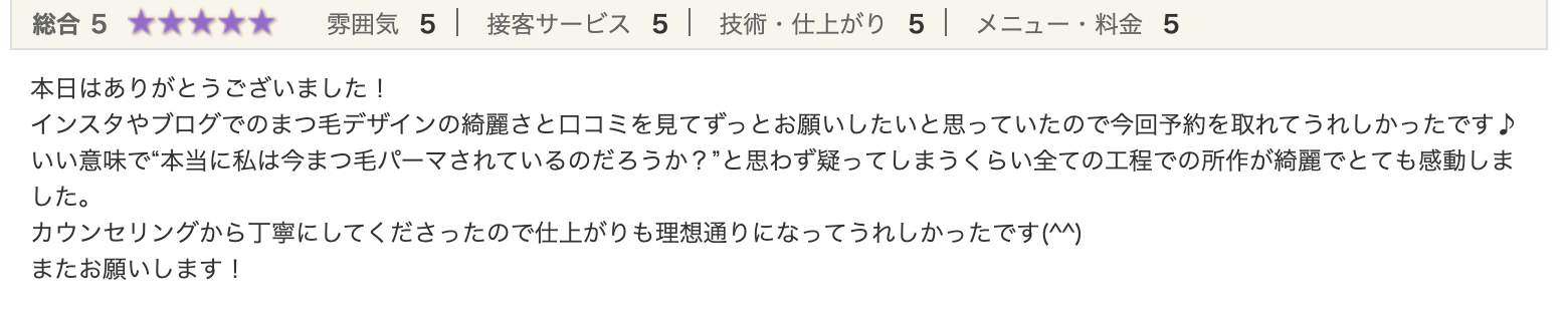 「2ヶ月ほど間が空いてしまったのですが、とてもきれいに仕上げていただきました!鏡をみると目が生き返ったーと感じます(笑)」