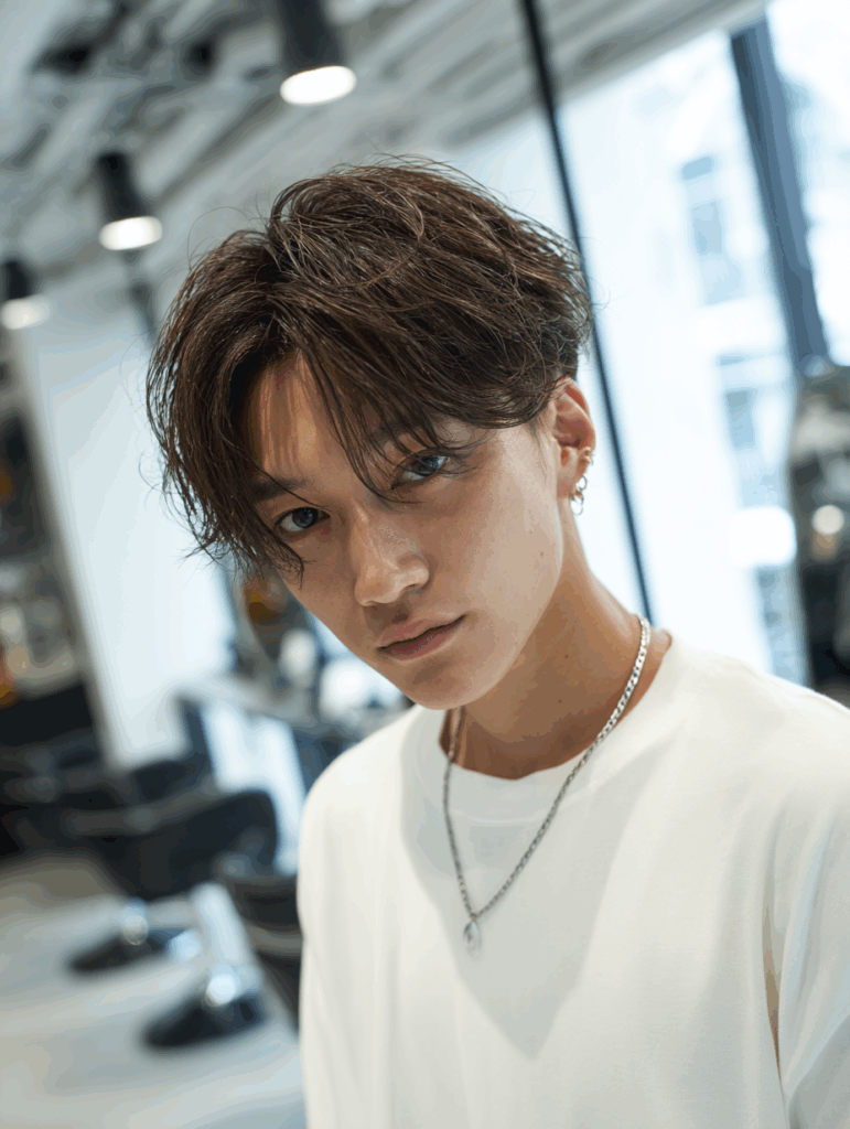 “自然見せ”のメンズ パーマは、強いカールで盛るのではなく、直毛に柔らかさと立体感を足すイメージ。トップにほどよいボリューム、前髪は目にかからない長さ、もみあげと襟足は清潔に整える——この設計なら、初めてのメンズ パーマでも上司・取引先からの印象を崩しません。名駅のビジネス環境では移動や会食も多く、1日を通して「清潔に持つ」ことが重要。そこで活きるのが、弱〜中強度でコントロールしたメンズ パーマです。