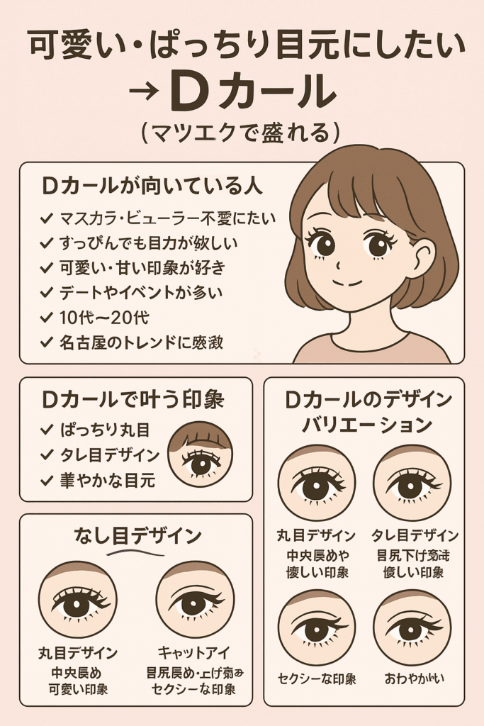 ✓ 「マツエクが見えない」→ Dカールで飛び出す ✓ 「下向きまつ毛」→ Dカールで上向きに ✓ 「目が小さく見える」→ Dカールでデカ目 ✓ 「ビューラーしても上がらない」→ Dカールなら大丈夫