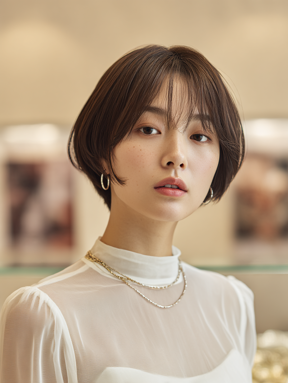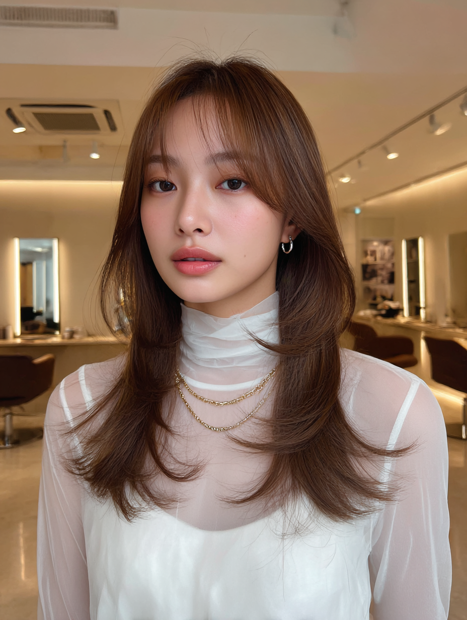 質感の調整: 重ためのラインは残しつつ、顔まわりにだけ「韓国レイヤー」を。これにより、耳にかけた時や、ふとした瞬間に柔らかな毛流れが生まれ、大人可愛い抜け感が完成します。