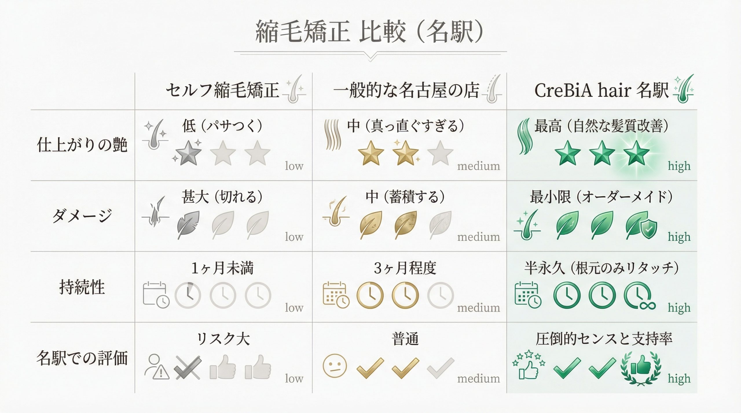 名古屋名駅CreBiA hairでは、お客様が過去に名駅で受けた縮毛矯正の「不満点」を最も重視します。 他店との違いは、単に癖を伸ばすだけでなく、名古屋での生活に馴染む「柔らかい質感」を目指すこと。名駅での縮毛矯正体験をアップデートするのが私たちの使命です。