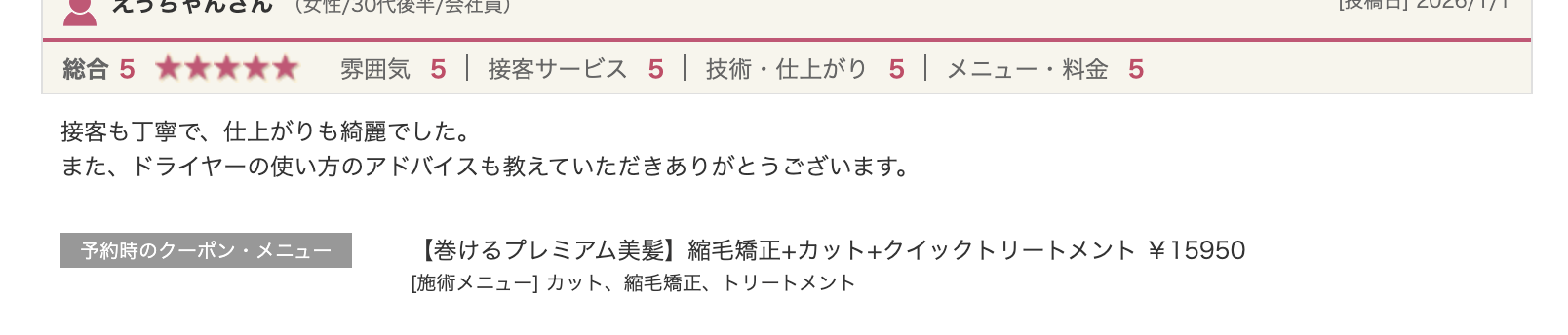 また、使用する薬剤や処理工程も、30代の髪質を前提に設計されています。髪質改善という言葉だけが先行しがちな中で、必要以上に負担をかけない低ダメージ設計を徹底している点は、長く通う上で安心できるポイントです。実際に、1回目で変化を感じたあと、回数を重ねるごとに扱いやすさが安定していくという声が多いのも、こうした積み重ねを重視しているからこそと言えます。