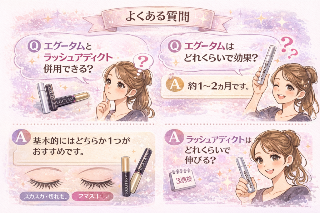 エグータムとラッシュアディクトは併用できなくはありませんが、安全性・継続性・効果実感のバランスを考えると、基本はどちらか1つを選んで使うのがベストです。