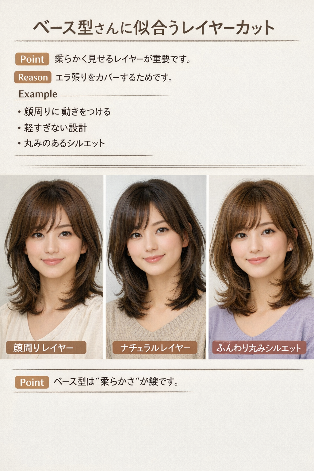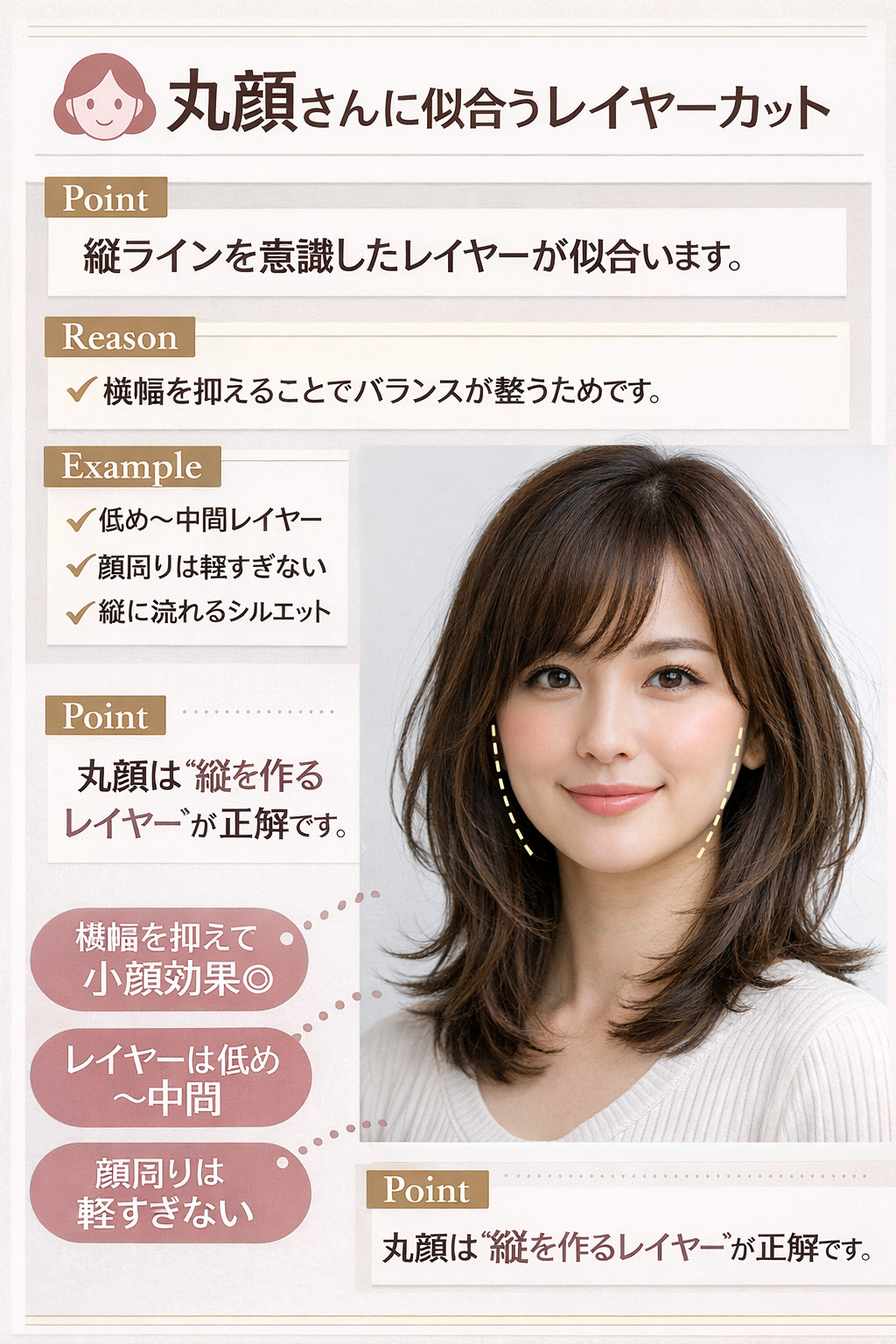 丸顔の場合は、縦ラインを意識したレイヤーを入れることで、顔型のバランスを整えることができます。低め〜中間レイヤーが特におすすめです。