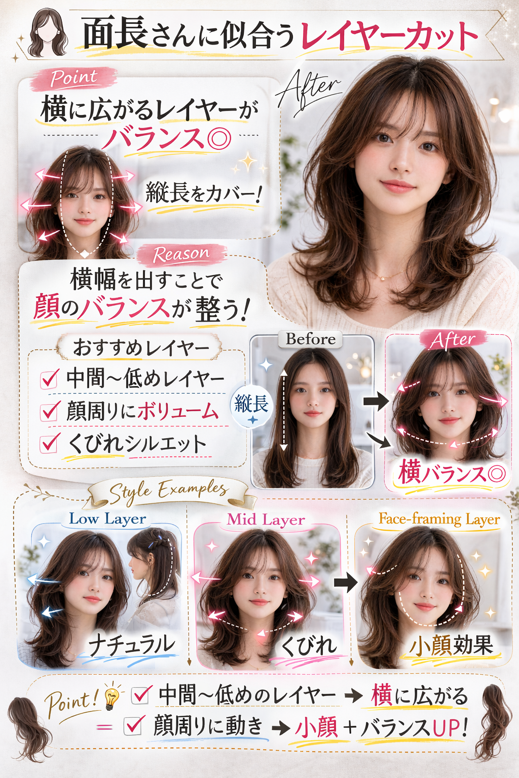 レイヤーの高さを間違えると縦長が強調されるため、顔型に合わせた調整が重要です。